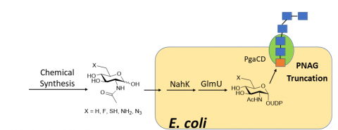 Bacteria love sugar. Sugars are their preferred carbon source, form the skeleton of their cells, and make up the polymers that are the outermost structures that contact the environment. We study the synthesis, modifications and properties of a key bacterial polysaccharide involved in biofilm formation called poly-N-acetylglucosamine (PNAG).